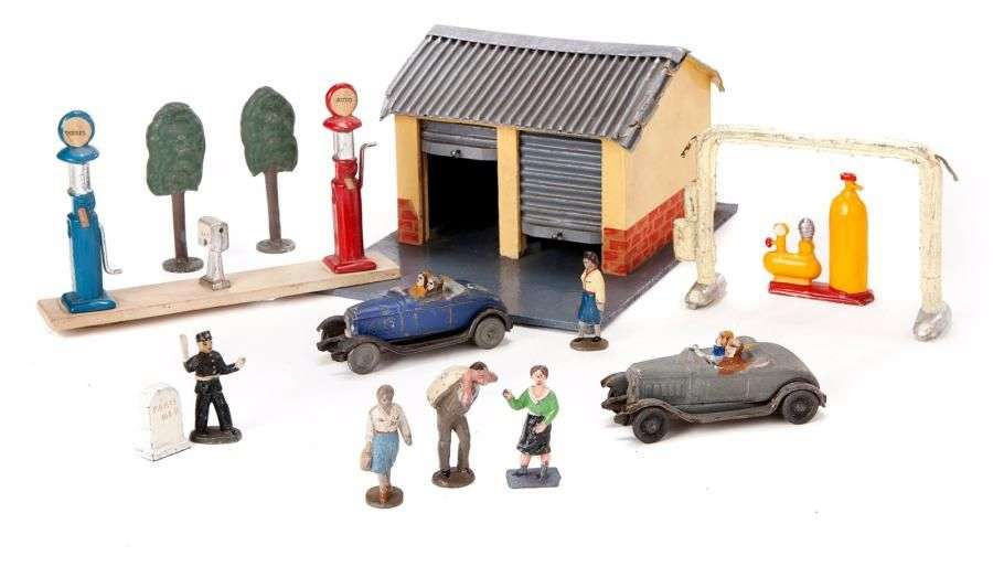 GARAGE à double rideaux en bois laqué avec pompes à essence et accessoires.