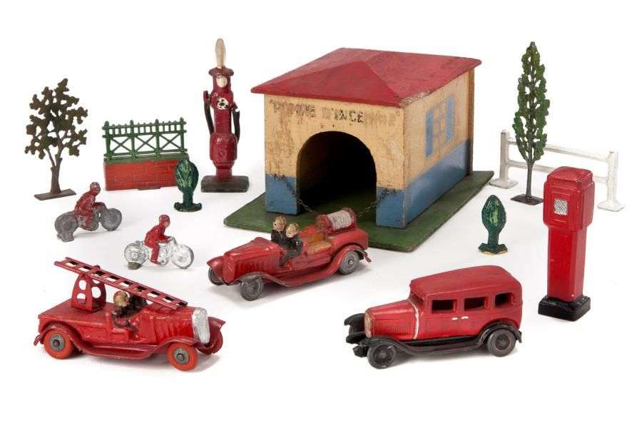 POSTE d'INCENDIE en bois laqué avec véhicules 1er secours et accessoires.