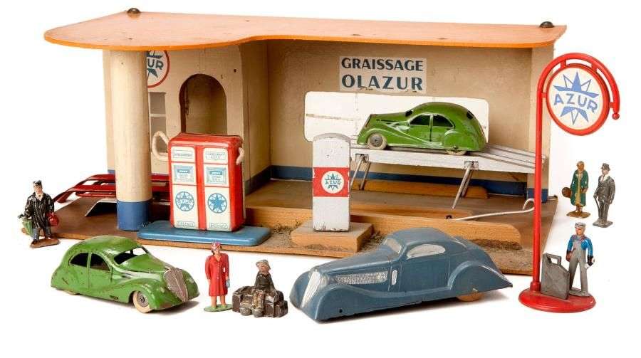 Station-service avec personnages et accessoires. Deux voitures RENAULT VIVA Grand Sport.