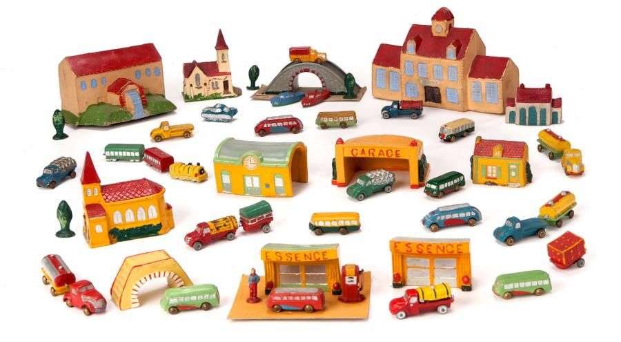 Village avec bâtiments tels que églises - station-service - mairie - minoterie - garage - autocars - camions - semi-remorques et bateaux.