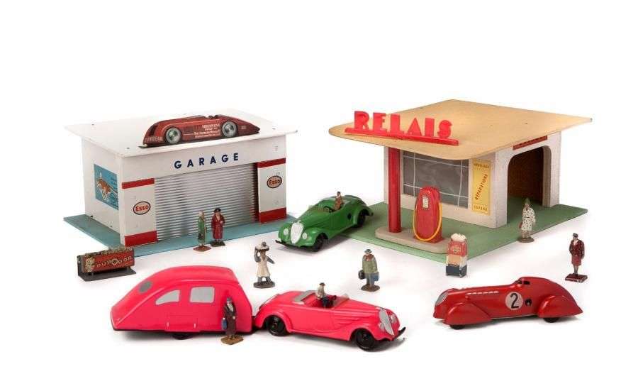 GARAGE ESSO avec bâtiment RELAIS, Cabriolet avec caravane - véhicules celluloïd - personnages et accessoires.