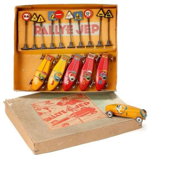 Boite RALLYE JEP comprenant 6 voitures de course DELAGE en tôle emboutie, numérotées de 1 à 6, avec signaux.
