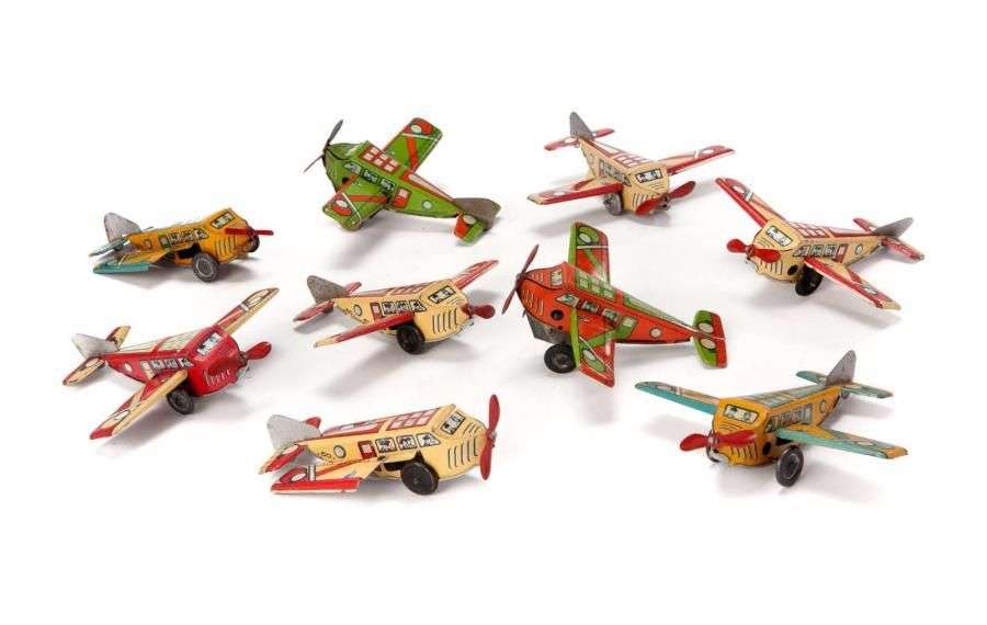 Neuf avions en tôle lithographiée, dont 2 mécaniques, monomoteur avec passagers et pilotes.