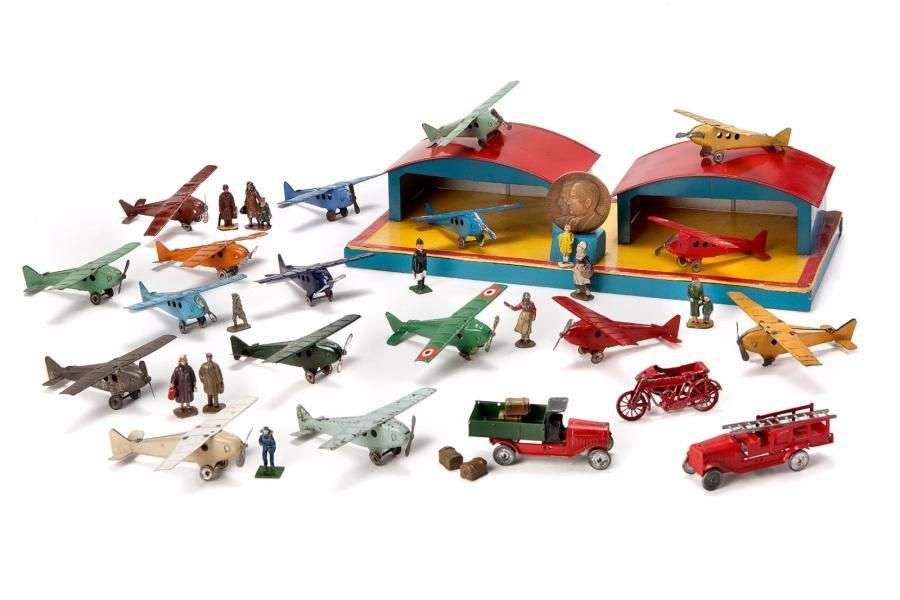 Deux hangars d'Aérodrome avec 17 avions en tôle, type Penny Toys - personnages et 2 camions benne et pompiers.