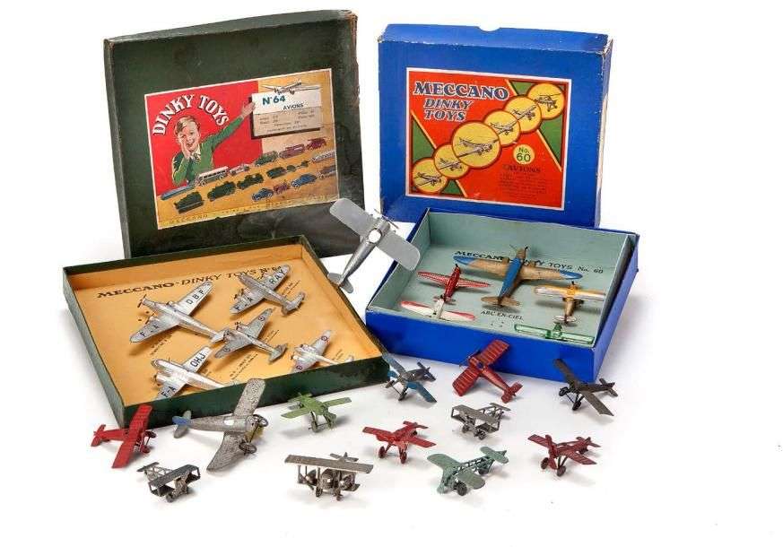 Boite AVIONS MECCANO DINKY TOYS n° 64 comprenant 5 avions (état moyen).