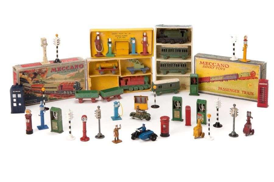 Train marchandises dans Boite «VOYAGEURS n° 18» - train voyageurs dans sa boite n° 20 - PETROL PUMPS et OIL BIN n° 49. Lot divers de cabines - side-car - motocycliste - feux.