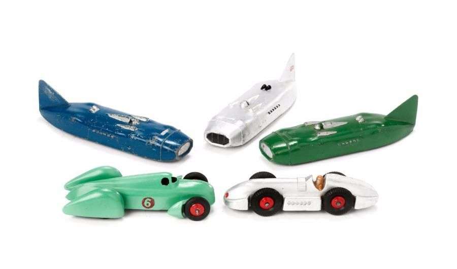 Cinq voitures de course dont STREAMLINED, réf. 23 S (3 exemplaires: argent avec drapeau anglais, vert et bleu) - AUTO-UNION, réf. 23 D et SPEED of the WIND, réf. 23 E.