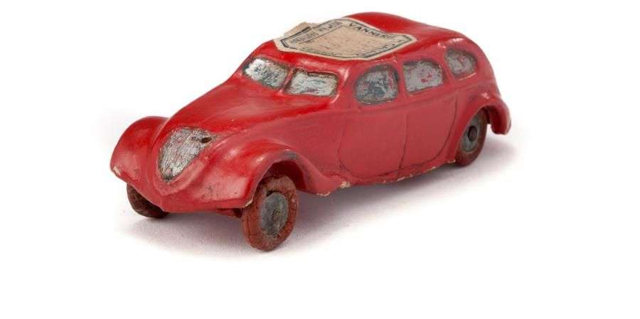 PEUGEOT 402, conduite intérieure rouge, 6 glaces, avec pneus. Porte l'étiquette du magasin où elle fut vendue: