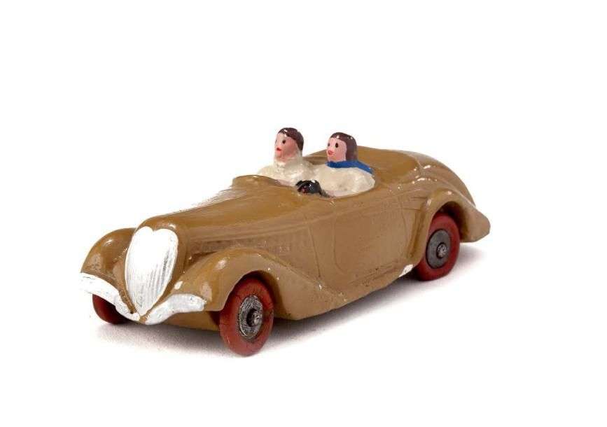 PEUGEOT 402 - Roadster, moutarde, pneus, deux personnages (repeints) L=11cm.