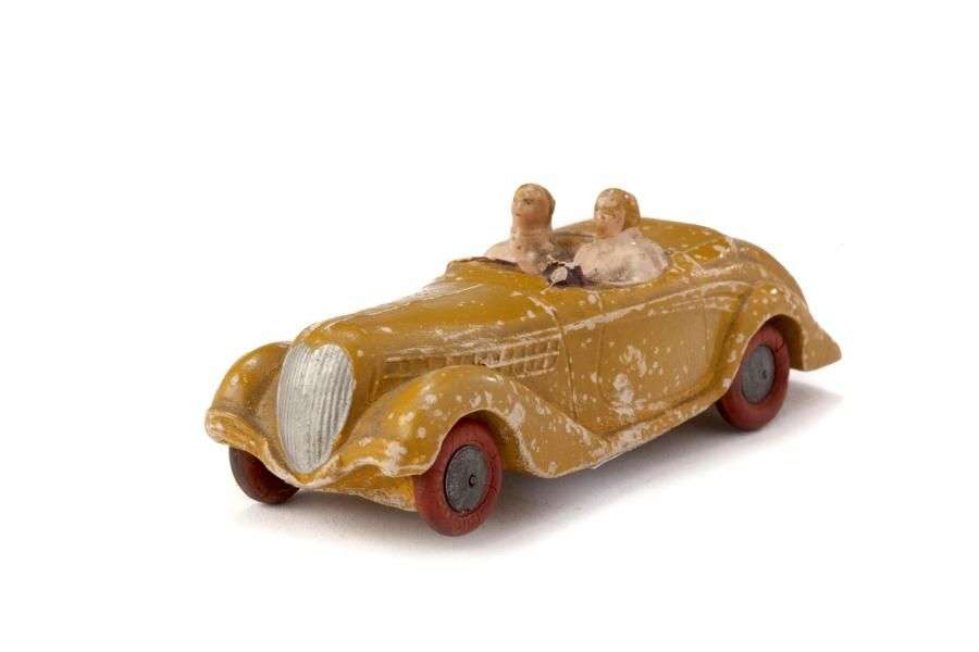 PEUGEOT 402 - Roadster moutarde, pneus, deux personnages. Etat d'usage d'origine. L=11cm.