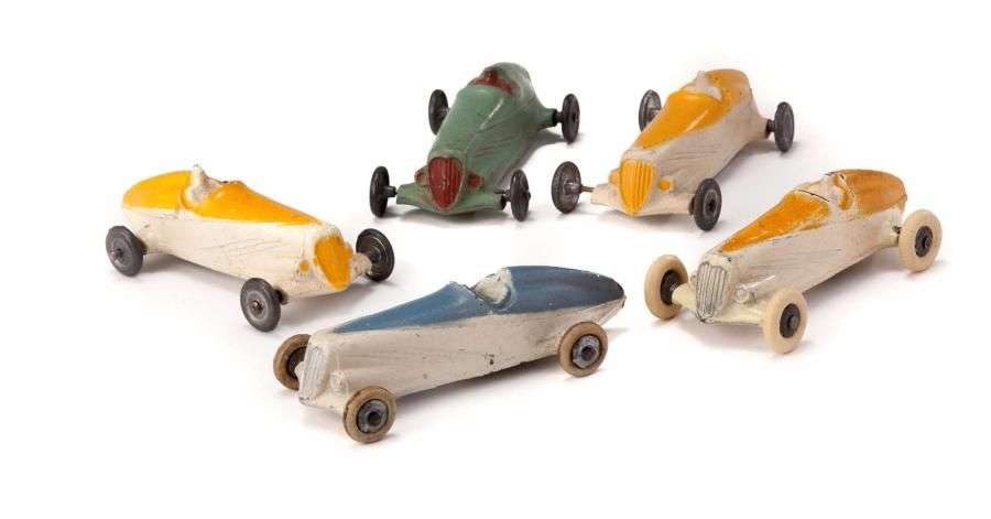 Cinq voitures de course «BOUBOULE» (petits accidents) peinture en 2 tons, roues métal (x 3) - pneus (x 2)