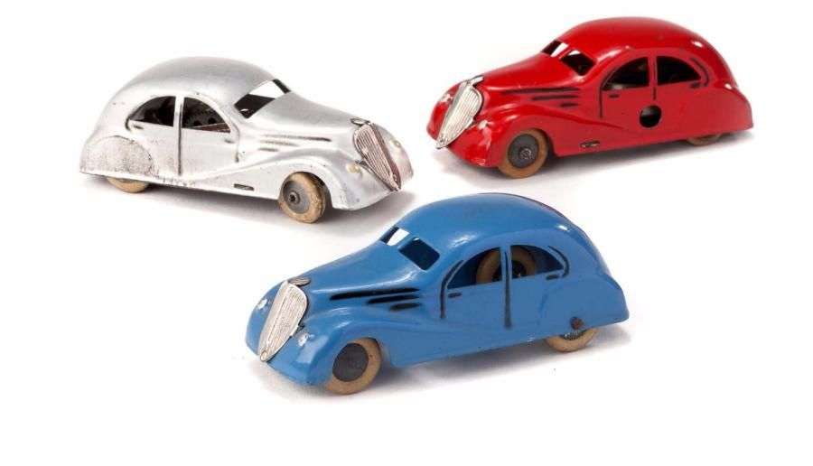 Trois véhicules Grand Sport, motorisés (x 2) et non motorisé, avec radiateur nickelé et pneus, rouge - gris argent - bleu, L=10cm.