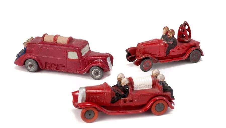 Autos pompes réf. 631/C, 3 modèles différents, incomplets, roues métal et pneus,