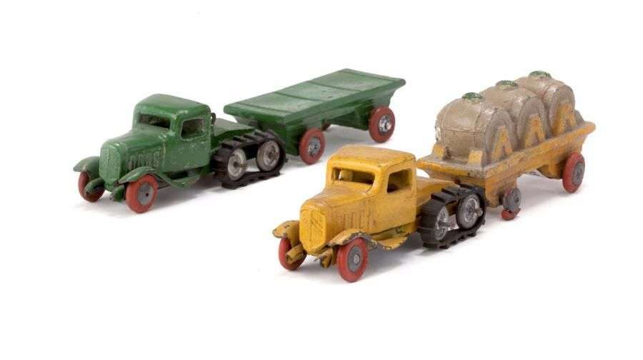 - Tracteur chenille, jaune avec remorque porte fûts jaune, réf. 641/C. L=17cm.