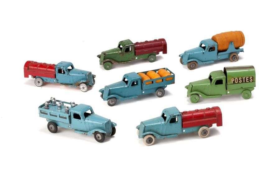 LATIL - 7 camions utilitaires variés, dont Poste - laitier et citerne, L=9cm.