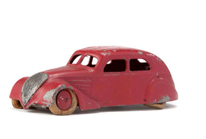 PEUGEOT 402 -1936, Berline, non motorisée «REGULATEUR DE CONSOMMATION D'ESSENCE» pneus blancs, jantes sans gorge, bordeaux, L=11cm.