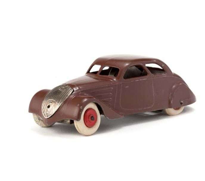 PEUGEOT 402 - 1936-37, Coach 2 portes, repeinte marron, pneus blancs, jantes avec gorge, L=11cm.