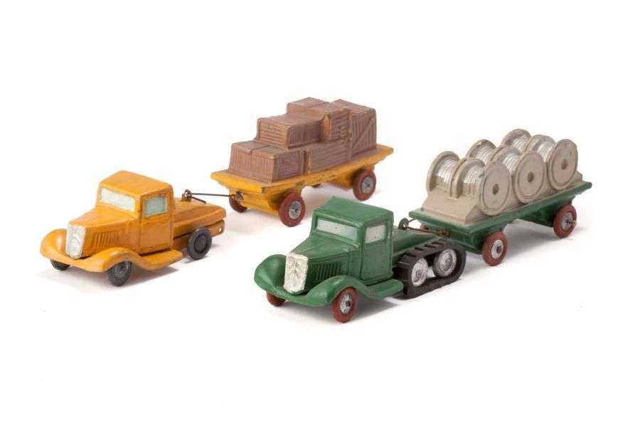 - Tracteur T 23, vert avec chenille et remorque chargée de bobines de câble verte, L=19cm.