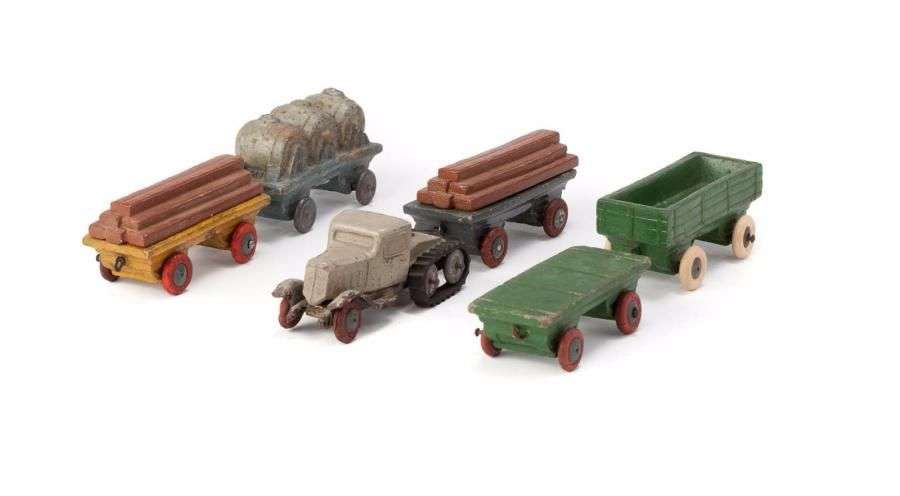 Tracteur à chenille gris avec 5 remorques assorties: plat - ridelles - porte futs - porte planches, L=17cm.