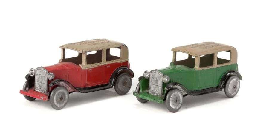 - Berline PEUGEOT 201, roues métal, rouge, châssis noir et toit beige «ROUES AVANT INDEPENDANTES PEUGEOT».