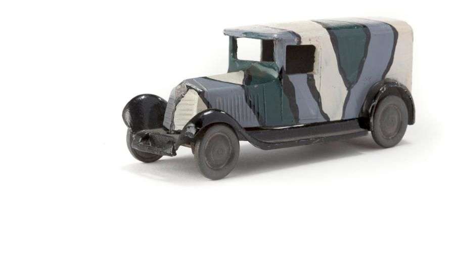 Fourgonnette militaire, roues métal, peinture camouflage, châssis noir.