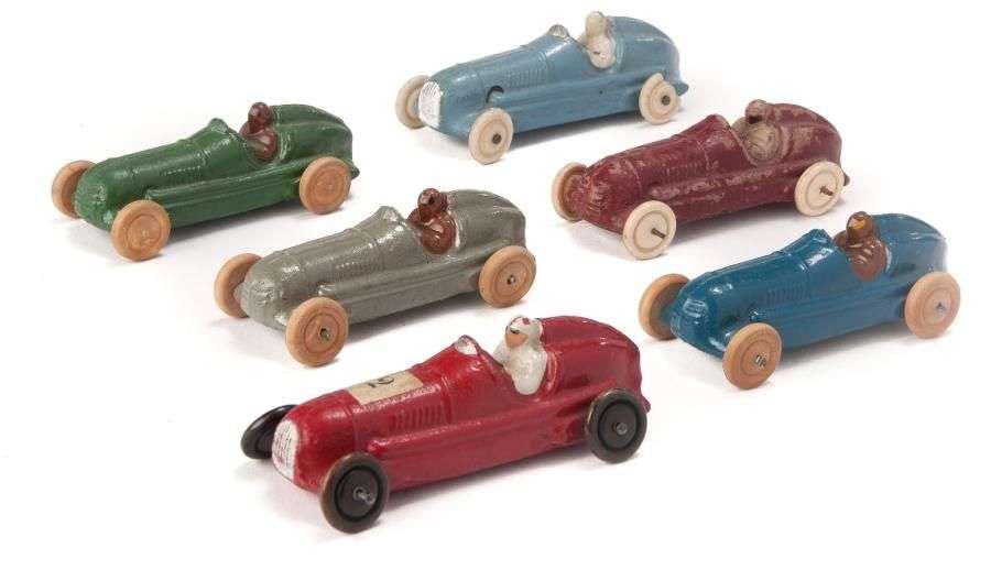 Six voitures de course de couleurs assorties, avec roues bois et composition.
