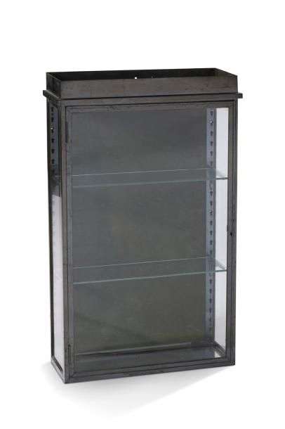 Petite vitrine murale rectangulaire en acier type industriel patinée noir L'intérieur supportant deux tablettes en verre.