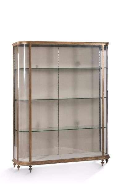 Grande vitrine en verre bombé, et armature en laiton, l'intérieur comprenant trois tablettes en verre. L'ensemble reposant sur six pieds toupies