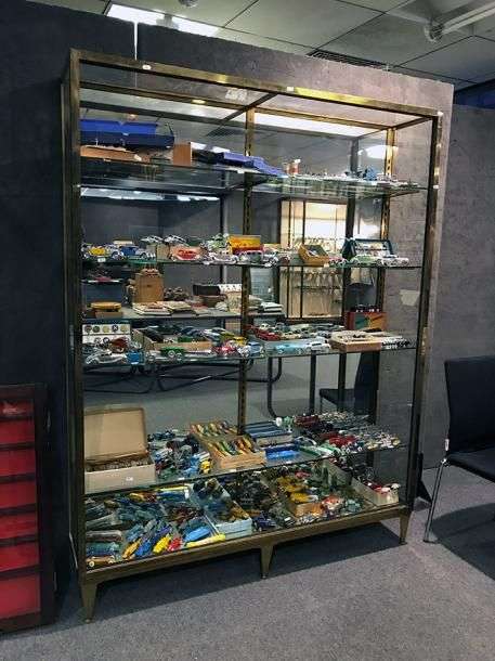Vitrine en laiton à deux portes coulissantes, fond de glace et huit étagèr