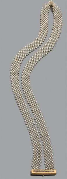 Sautoir composé d'une ruban tressé de petites perles fines. Au centre une barrette en or jaune 18K (750) sertie d'une ligne de diamants taillés en rose.