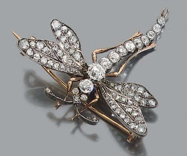 Broche "libellule" en or jaune 18K (750) et argent (<800) sertie de diamants de taille ancienne et taillés en rose. Epoque XIXème
