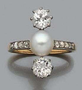 Bague en or jaune et gris 18k (750) sertie d'une perle fine entre deux diamants de taille ancienne sur une petite ligne de diamants taillés en rose.