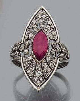 Grande bague navette en or gris 18k (750) sertie d'un rubis de forme navette dans un entourage ajouré serti de petits diamants de taille ancienne.