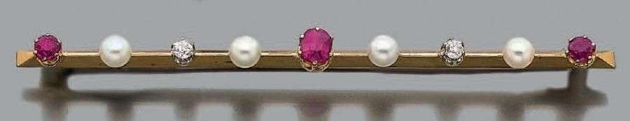 Broche barrette en or jaune 18k (750) sertie d'une alternance de rubis, diamants et perles fines.