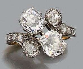 Bague "toi et moi" en or jaune et gris 18k (750) sertie de deux diamants de taille ancienne sur une petite ligne de diamants taillés en rose.