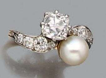 Bague "toi et moi" en or jaune et gris 18k (750) sertie d'un diamant de taille ancienne et une perle fine sur une petite ligne de diamants en chute.