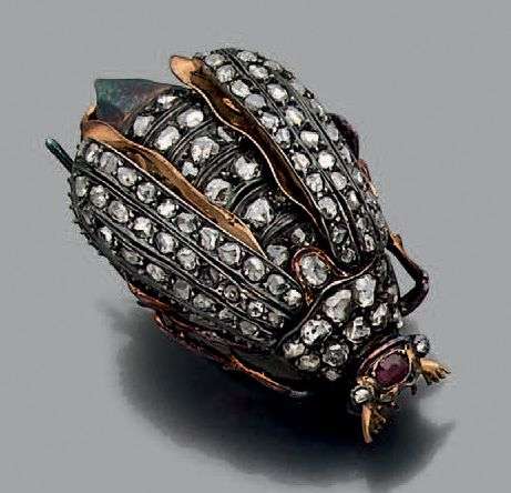 Broche "scarabé" en or jaune 18k (750) et argent (< 800) sertie de diamants taillés en rose et d'un rubis sur la tête. Epoque XIXème