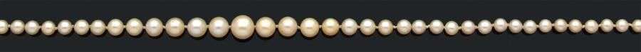Collier composé de 85 perles supposées fines - non testées, en chute. Fermoir baton serti de diamants taillés en rose.