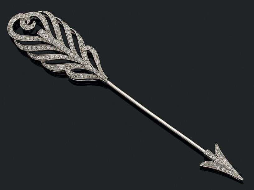 Epingle à jabot dessinant une flèche en platine (950) sertie de diamants de taille ancienne