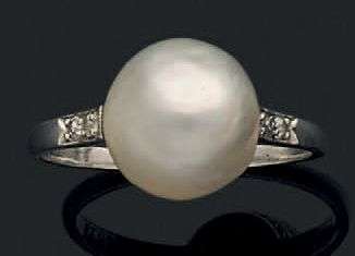 Bague en platine (950) ornée d'une perle fine épaulée de petits diamants t