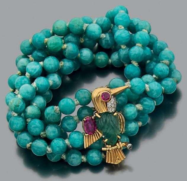 Bracelet composé d'une torsade de perles de jade et orné pour le fermoir d'un clip "oiseau" serti d'une émeraude gravée, de rubis et brillants. Trace de poinçon de maître.