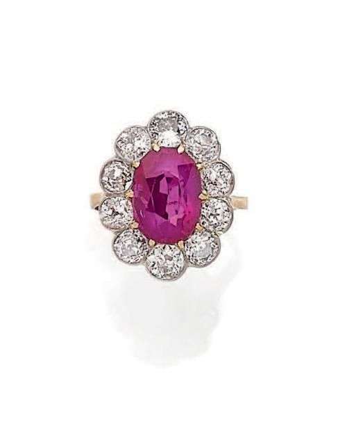 Bague en or jaune et gris 18k (750) sertie d'un rubis ovale dans un entourage de diamants de taille ancienne. Vers 1870