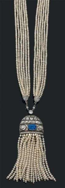 Sautoir composé de six rangs de petites perles fines retenant au centre un pendentif amovible composé d'un dome ciselé d'un décor géométrique serti de diamants de taille ancienne et taillés en rose rehaussés d'un saphir central épaulé de deux diamants de taille ancienne.