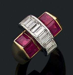 Bague chevalière en or jaune 18k ( 750) et platine (950), chevrons sertis de quatre rubis rectangulaires surmontés d'un demi disque serti de diamants baguettes.