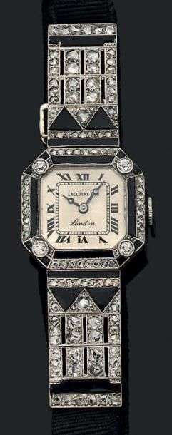 Montre de dame en platine (950) rehaussé d'onyx. Cadran argenté de forme carré, chiffres romains, aiguilles Breguet. Mouvement mécanique, Freq 18000 alt/h. Boitier 2 corps, lunette octogonal et partie central du bracelet tous deux sertis de roses et d'onyx. Bracelet ruban noir, boucle glissière or blanc. Fonctionne, bon état. Un manque onyx remplacé. Dim 20x65 mm. anses comprise.