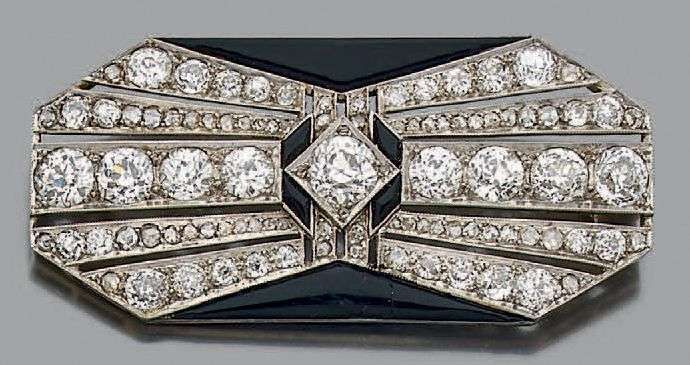 Broche de forme rectangulaire à pans coupés en platine (950) et or gris 18K (750) ciselé d'un décor géométrique serti de diamants de taille ancienne rehaussés d'onyx.