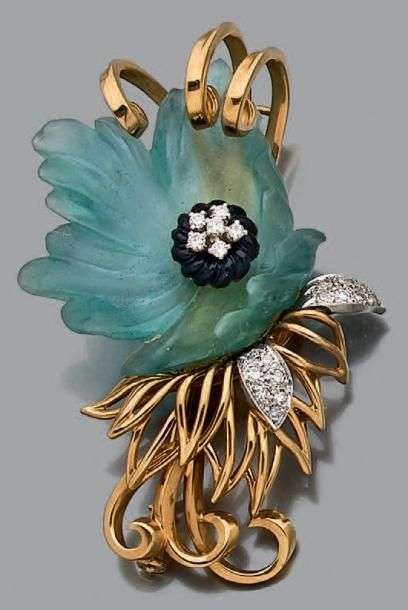 Broche en or rose et gris 18k (750) composée d'une fleur en pierre dure bleue translucide gravée et onyx rehaussée de diamants sur le pistill et le feuillage.