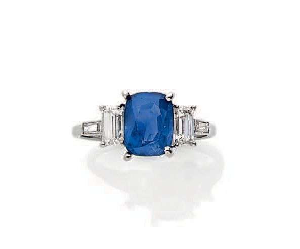 Bague en platine (950) sertie d'un saphir de forme coussin épaulé de diamants de taille émeraude et baguettes.