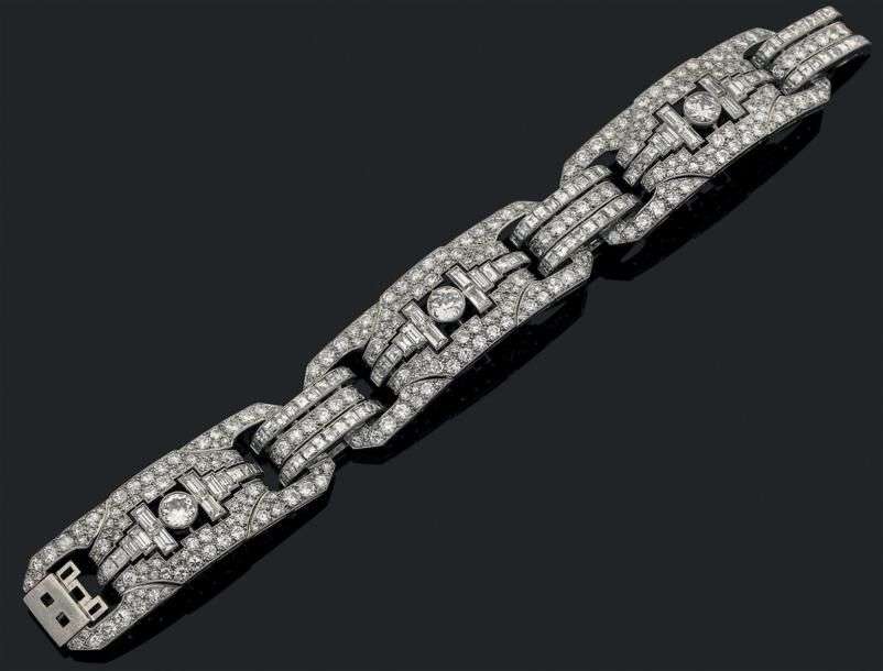 Bracelet ruban articulé en platine composé de trois motifs à décor géométrique serti de diamants de taille brillant et princesse rehaussés de trois diamants plus importants.