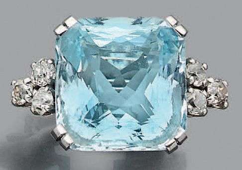 Bague en or gris 18k (750) sertie d'une importante aigue-marine rectangulaire de forme coussin épaulée de trois diamants de taille ancienne.